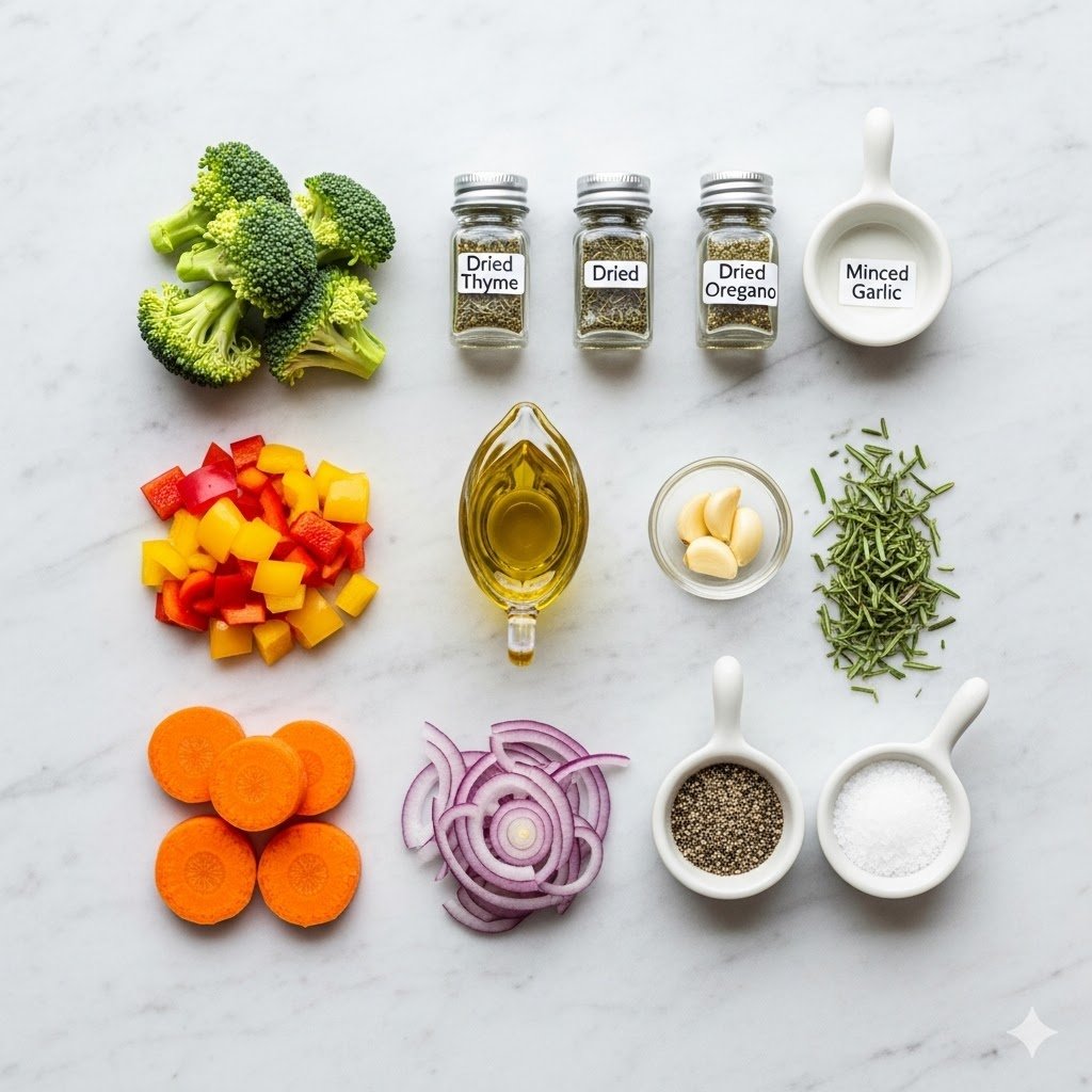 - Season: In a large bowl, combine the broccoli, bell pepper, red onion, and carrots. Drizzle with oil and sprinkle with the dried thyme, oregano, salt, and pepper. Toss vigorously until every piece is evenly coated.