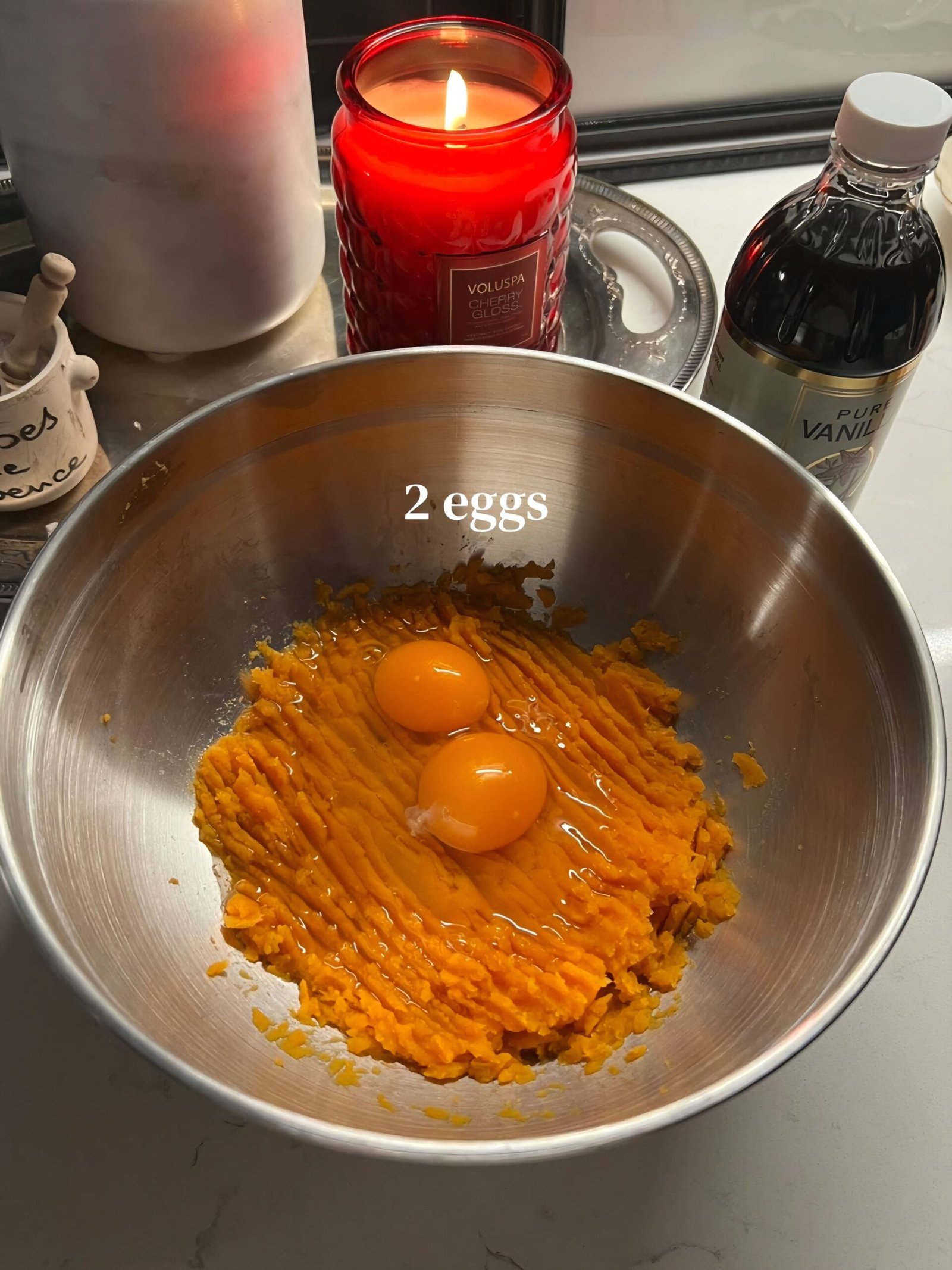 Crack 2 eggs directly into the bowl with your mashed sweet potato. The eggs help bind everything together and create that classic brownie structure.