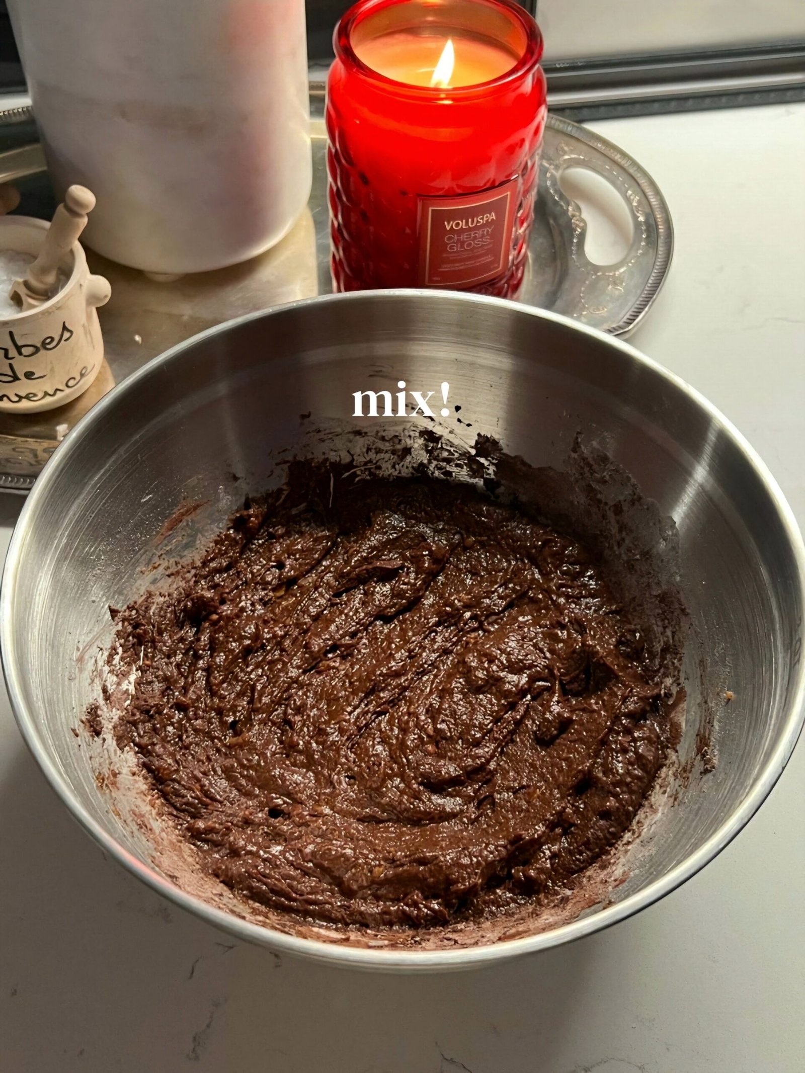 Now stir everything together until just combined. Donβt overmix! You want a thick, glossy batter.