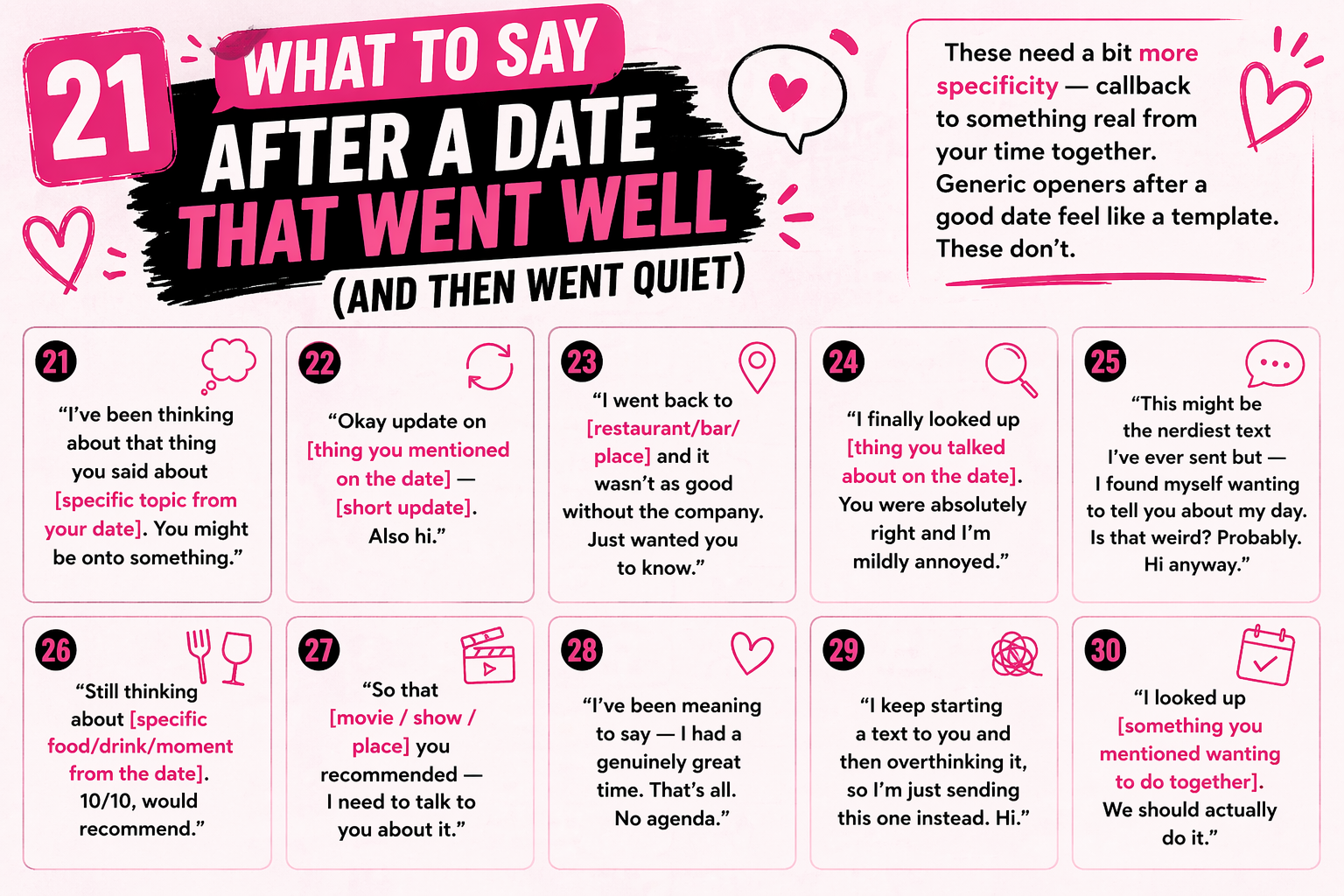 These need a bit more specificity — callback to something real from your time together. Generic openers after a good date feel like a template. These don’t.