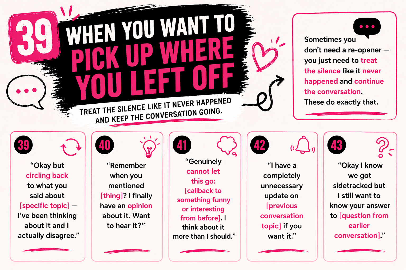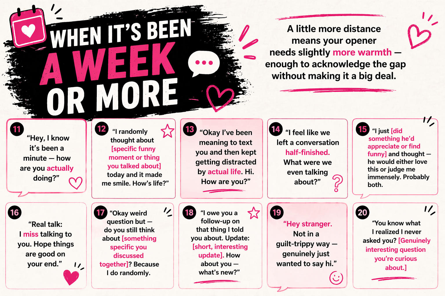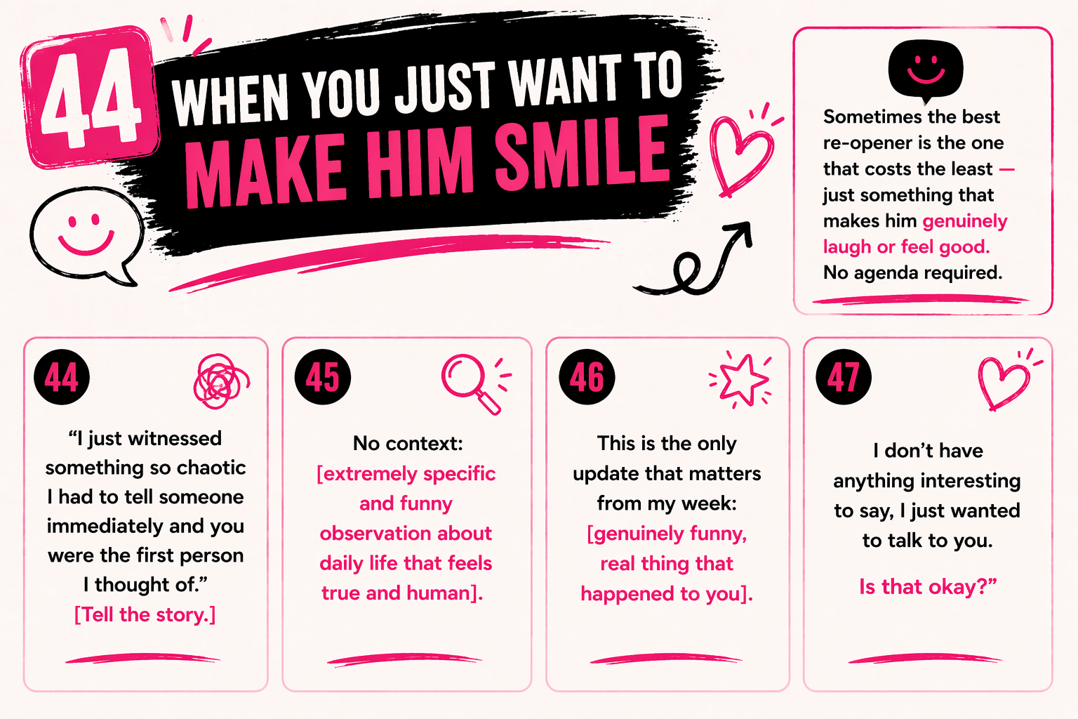 The best conversation-revival texts are light, specific, and genuinely you. They open a door without demanding he walk through it immediately. They give him something to respond to — a question, a laugh, a shared reference — that makes replying feel natural rather than obligatory.