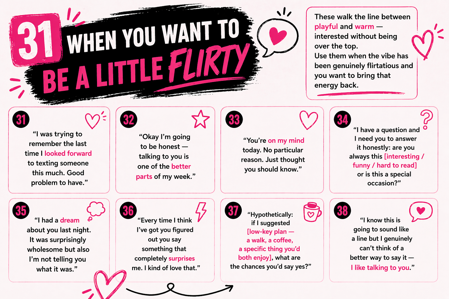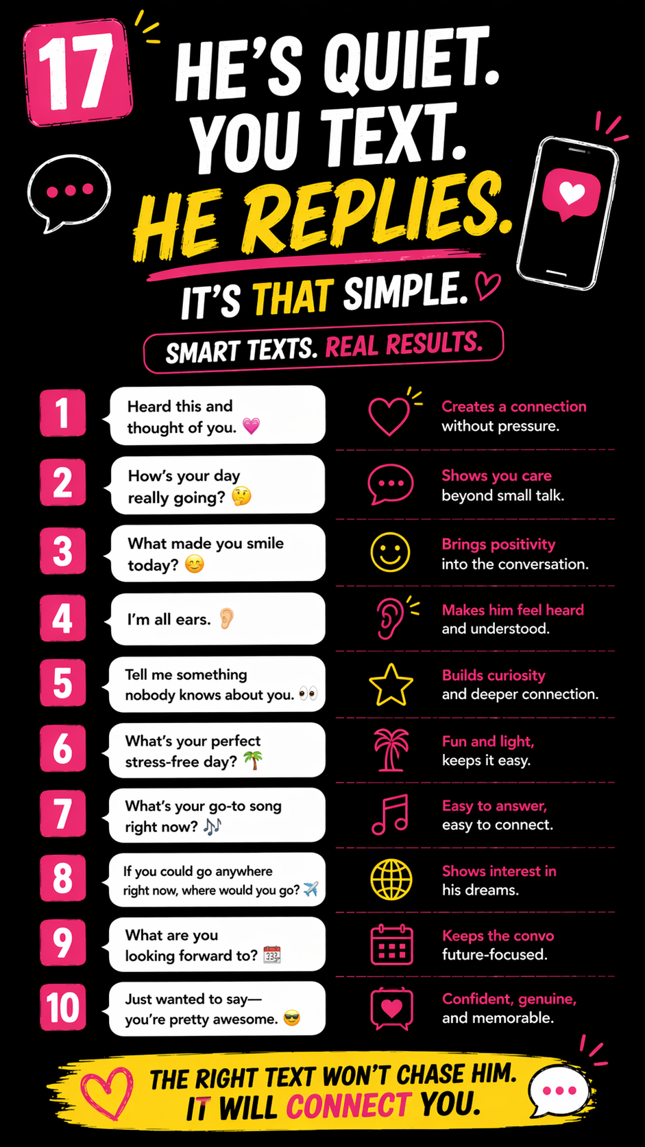 The texts that work aren’t clever manipulation tactics. They’re not designed to make him feel like he’s missing out or to play on his ego. They’re just genuinely good conversation starters — warm, interesting, specific, and low-pressure enough that responding feels easy and natural.