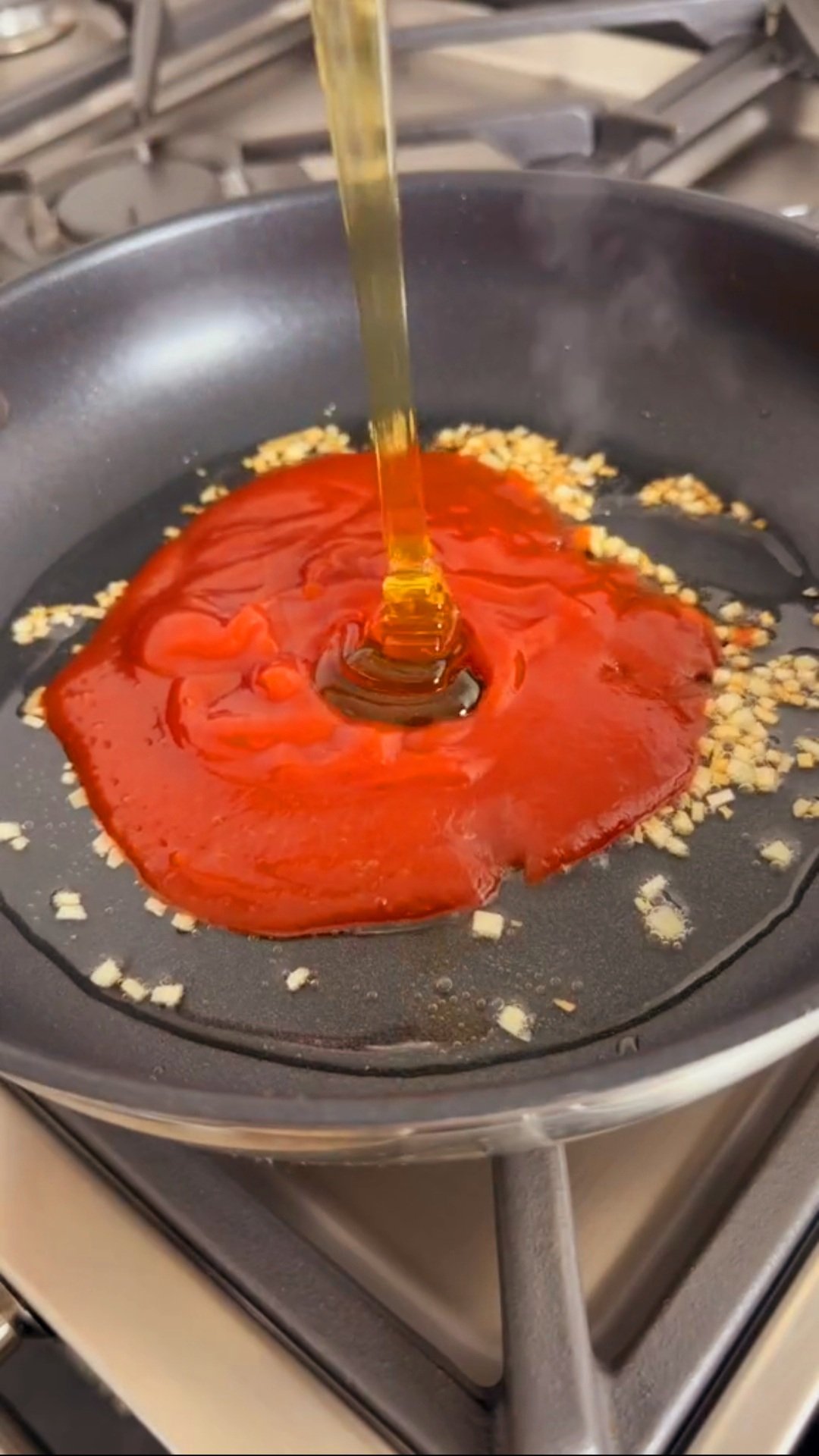 - Make Sauce: Reduce heat to medium. Add garlic and ginger to the skillet and sautΓ© for 30 seconds until fragrant. Add honey, soy sauce, rice vinegar, and red pepper flakes. Whisk, scraping up browned bits from the pan.